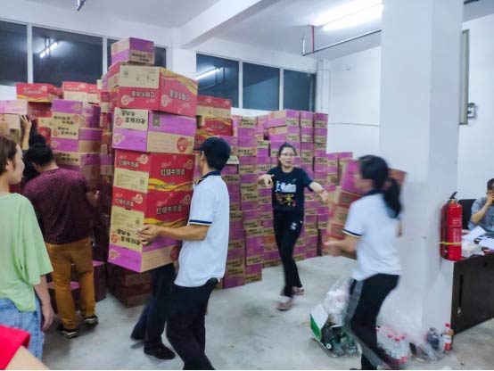 晚上19:38,速爾快遞成都中心和宜賓網(wǎng)點人員跟著愛心物資專用車,繼續(xù)來到了第二站救災點——宜賓長寧縣。到達救災點后,他們馬上將愛心救援物資搬運至放置點。