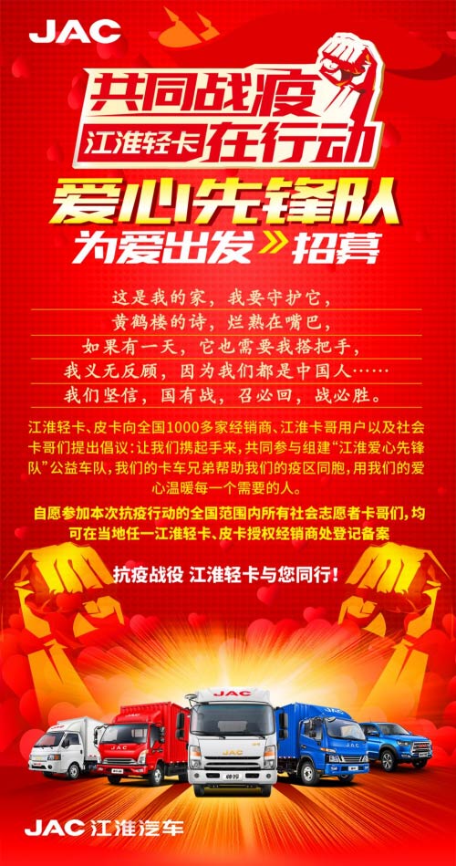 江淮輕卡、皮卡向全國1000多家經銷商、江淮卡哥用戶以及社會卡哥們提出倡議:讓我們攜起手來,共同參與組建“江淮愛心先鋒隊”,自愿參加本次抗“疫”行動的卡哥志愿者均可在當地任一江淮輕卡、皮卡授權經銷商處登記備案,通過審核后,當地江淮輕卡授權經銷商擔任領隊,并主動聯系當地抗疫相關部門,帶領愛心卡哥積極配合當地疫區物資運輸相關部門的工作。