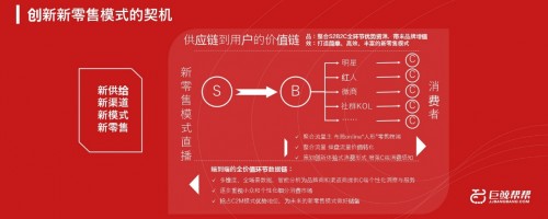 新零售的創新契機總結一句話就是,供需直連。巨鯨幫幫在供應鏈到用戶價值的全鏈路梳理中更加高效。把傳統的S端和消費者鏈接起來,通過小B(明星KOL/KOC、微商等等這些角色),把好貨帶到我們的渠道、消費者的面前。