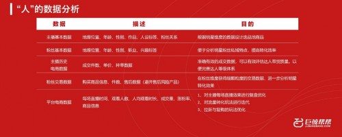 運營側講求人貨場流的組合。怎樣以人推貨,以貨推人,其實人是非常重要的。我們有五個維度的分析數據:第一個就是主播的數據:主播的一個地域性、性別、作品,還有人設標簽是非常重要的。