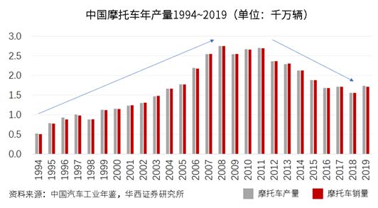 華西證券2020年發(fā)布的《摩托車:消費升級新方向》報告顯示,受制于各方面因素影響,摩托車市場產(chǎn)銷量均處于萎縮狀態(tài):一方面, 汽車和電動自行車產(chǎn)銷規(guī)模快速增長,成為了人們重要的代步出行工具,摩托車消費受到擠壓;另外一方面,目前全國共有93個城市出臺了摩托車限行政策,摩托車的使用范圍遇到諸多不便,壓制了摩托車的消費需求。