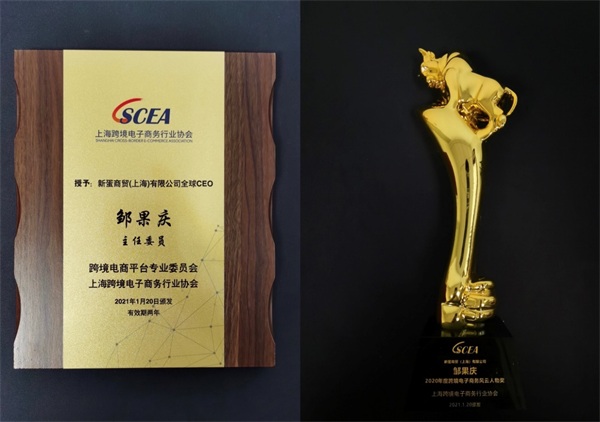 2021年1月20日,在上?缇畴娮由虅招袠I(yè)協(xié)會成立8周年之際的“2021上?缇畴娚陶甙l(fā)布會”上,上海跨境電子商務行業(yè)協(xié)會為表彰新蛋集團全球CEO鄒果慶先生為推動上海跨境電商生態(tài)發(fā)展、賦能中國跨境賣家做出的突出貢獻,誠邀鄒果慶先生出任上?缇畴娮由虅招袠I(yè)協(xié)會專委會跨境電商平臺專委會主任委員,并授予“2020年度跨境電子商務風云人物獎”殊榮。新蛋中國也成功入選上?缇畴娚2020年度十大領軍企業(yè)榜單,榮獲“2020年度跨境電子商務領軍企業(yè)獎”。