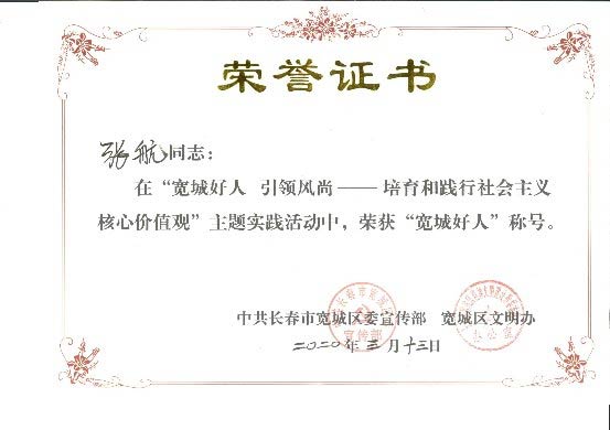 以上的事跡僅僅是張航在職期間好人好事的一部分,為了表彰張航敬職敬業、熱心公益、無私奉獻的精神,2020年,張航獲得了由長春市寬城區委宣傳部和寬城區文明辦授予的“寬城好人”稱號,同年,長春市總工會也授予了張航“五一勞動獎章”。