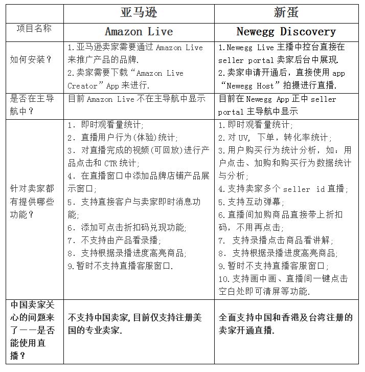 國際跨境電商巨頭亞馬遜及新蛋充分吸納中國電商直播經驗,紛紛進軍直播領域。巨頭們既有相似處,也有差異性。