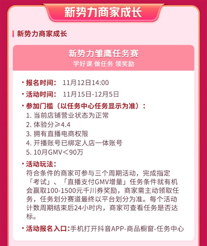 目前,抖音雙12好物狂歡季正在火熱招商中。該大促活動也為新勢力商家?guī)砹硕喾N玩法和豐厚的平臺福利。趕快參與報名,將在「新勢力雛鷹學(xué)習(xí)任務(wù)賽」中的所學(xué)、所獲轉(zhuǎn)化為生意新增量吧!