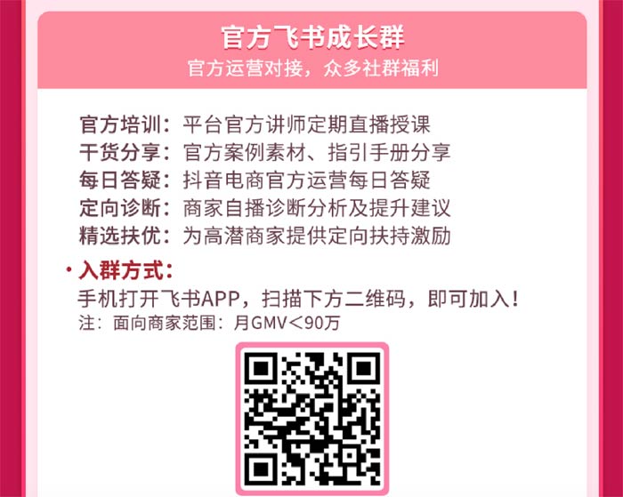 除缺乏規(guī)范系統(tǒng)的成長方法論指導(dǎo)外,不少剛?cè)刖侄兑綦娚痰男聞萘ι碳疫存在不知如何與平臺官方運營團(tuán)隊建立聯(lián)系、不知從何處及時得知官方的扶持資源和規(guī)則更新信息等痛點。為此,抖音電商平臺為新勢力商家開設(shè)了專屬飛書社群,提供官方運營對接服務(wù),高效助力商家快速解決經(jīng)營難題。