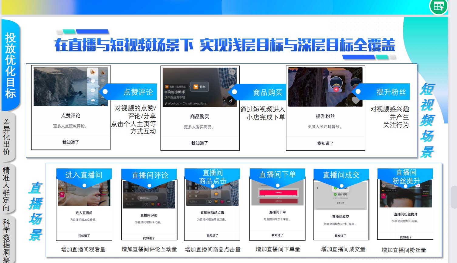 秘訣二:以四大產品功能幫助用戶最大化投放價值。小店隨心推還具備“投放優化目標、差異化出價、精準人群定向、科學數據洞察”四大產品功能。首先,投放目標更優化,在直播與短視頻場景下,實現淺層目標與深層目標全覆蓋。其次,出價方式更靈活,支持多種出價方式,兼顧手動出價與自動出價。另外,人群定向更精準,支持目標人群圈選,精準定向潛力人群。最后,投放效果更清晰,通過數據洞察與監測,讓投放效果隨時可查。