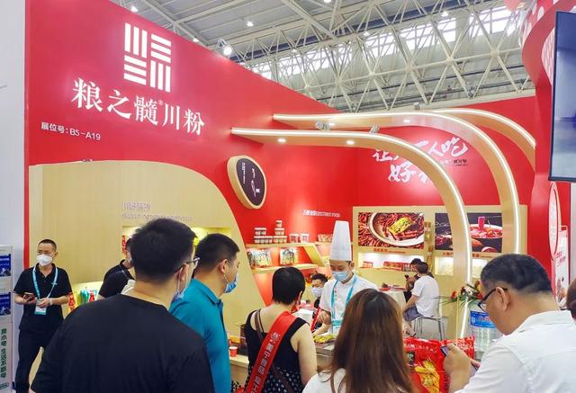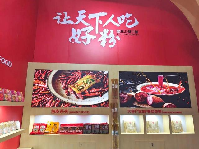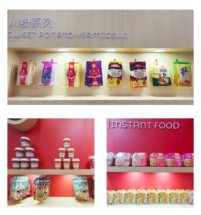 在產品陳列區繞川粉主題,集中展示了火鍋川粉、紫薯粉、方便速食系列等系列產品,其中包括拳頭產品糧之髓火鍋川粉228g,大客戶定制火鍋川粉等,以及老成都酸辣粉、熊貓筍金湯粉、紅油魔芋涼皮、酸辣粉調味料等新品。