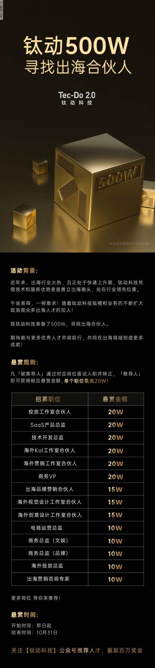 鈦動科技本次將拿出500W現金懸賞招募多個工作室合伙人及重點崗位,歡迎大家踴躍推薦,推薦越多,獎金越高!