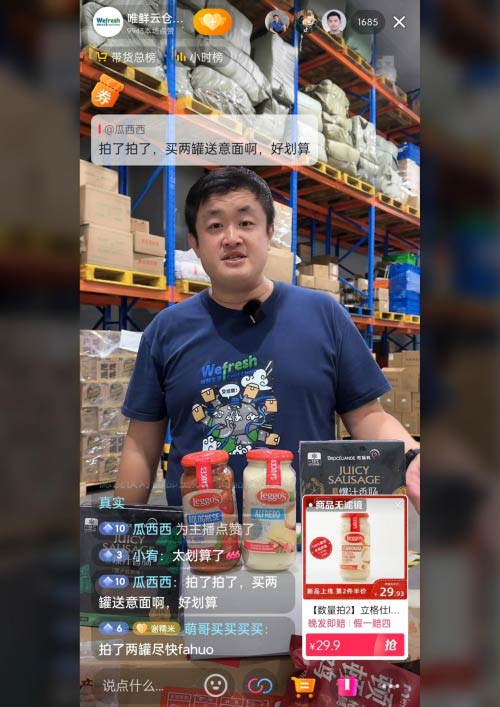 本次倉播由冷鏈食品及冷鏈物流行業專家、唯鮮生活宅配合伙人默然老師開展講述,他表示:“之所以做冷鏈倉播,也是因為我們具備著成熟的上下游冷鏈供應鏈,在全國擁有20+云倉,擁有十年以上冷鏈產品一件代發能力,完全能保障預制菜品、生鮮產品等多品類的食品品質和購買體驗”。
