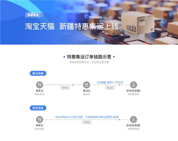 目前,淘寶將首期集運倉設置在了位于包郵區的杭州,這使得絕大多數商品可包郵送至集運倉,消費者基本只需支付第二段運費。一直以來,新疆的訂單包郵比例已達到8成,特惠集運服務上線后,全國發往新疆的不包郵訂單的平均運費進一步下降,從25元左右直降至5-6元左右,新疆消費者也可享受“個位數包郵”。