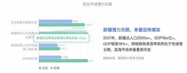 對商家而言,這大幅優化了商家向新疆地區發貨的流程與成本,并且激活了新疆潛在購買力。數據顯示,新疆宏觀基本面處于增長態勢,GDP增長率高達17%,居民收入和消費支出均增速高于全國平均水平,居民購買力增長快、消費意愿高。
