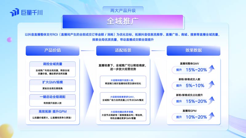 通過全域推廣,商家可以將推廣的范圍拓展至抖音信息流推薦、直播廣場(chǎng)、商城、搜索等直播全域流量,在全局拓量中,全方位地獲得更廣泛的客源,實(shí)現(xiàn)GMV的全面提升。