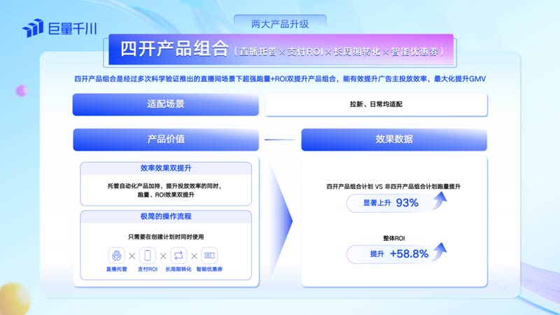 作為直播間場(chǎng)景下的超強(qiáng)跑量和ROI雙提升產(chǎn)品組合,四開產(chǎn)品組合將直播托管、支付ROI、長(zhǎng)周期轉(zhuǎn)化、智能優(yōu)惠券這四項(xiàng)主流投放能力強(qiáng)強(qiáng)聯(lián)合,充分釋放出這一套組合拳的疊加效應(yīng),從而幫助商家極大地提升投放效率,最大化提升GMV。