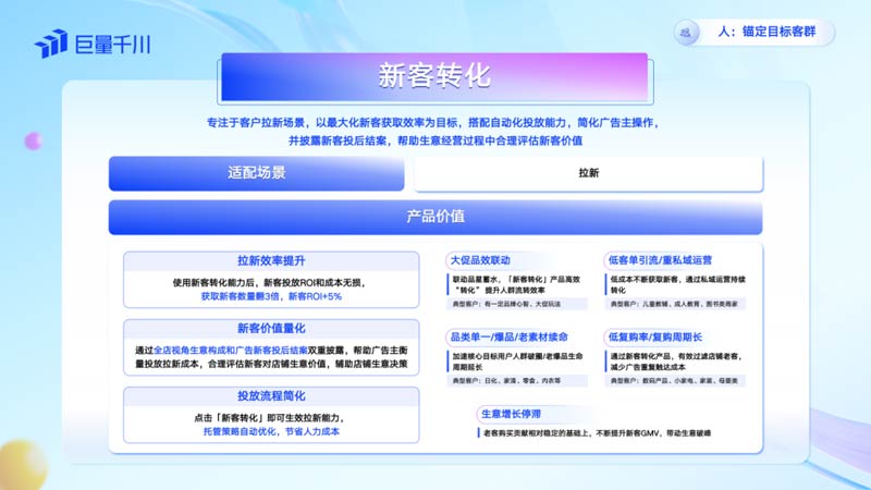 對(duì)應(yīng)「人」場(chǎng)景,巨量千川專注于商家的的拉新場(chǎng)景,以最大化新客獲取效率作為目標(biāo),幫助商家在生意經(jīng)營(yíng)過程中合理評(píng)估新客價(jià)值。商家使用新客轉(zhuǎn)化能力后,新客投放ROI和成本無損,獲取新客數(shù)量翻3倍,新客ROI提升5%。