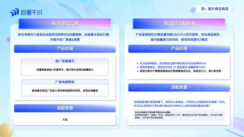 針對(duì)「貨」場(chǎng)景,重點(diǎn)貨品池可以聯(lián)合電商對(duì)大促重點(diǎn)貨品池提供定制樣式和流量策略,幫助商家快速打爆重點(diǎn)商品,而商品支付ROI則可以直接預(yù)估付費(fèi)流量貢獻(xiàn)GMV大小的可能性,對(duì)比商品購(gòu)買,有效保障ROI的穩(wěn)定達(dá)成。在投放過程中不需要根據(jù)商品價(jià)格頻繁修改出價(jià),投放壓力小。
