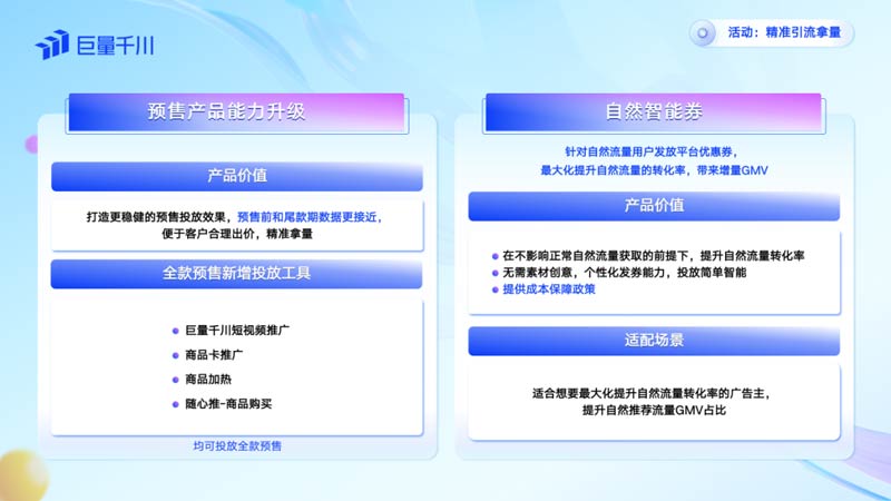 在「活動(dòng)」場(chǎng)景,巨量千川的預(yù)售產(chǎn)品能力升級(jí)可以打造更穩(wěn)健的預(yù)售投放效果,預(yù)售前和尾款期數(shù)據(jù)更接近,便于客戶合理出價(jià),精準(zhǔn)拿量,而自然智能券則可以個(gè)性化發(fā)放優(yōu)惠券,最大化提升自然流量的轉(zhuǎn)化率,帶來增量GMV。