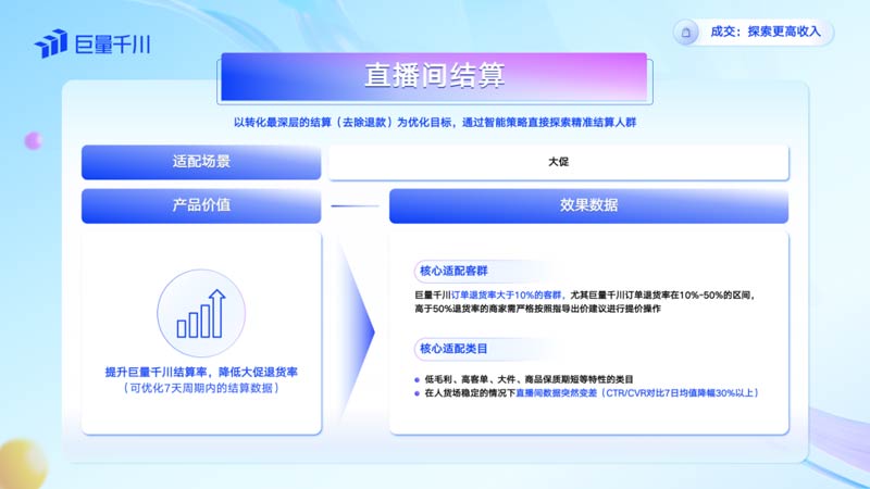在「成交」場(chǎng)景,巨量千川的直播間結(jié)算會(huì)以轉(zhuǎn)化最深層的結(jié)算(去除退款)為優(yōu)化目標(biāo),通過智能策略直接探索精準(zhǔn)結(jié)算人群,在大促期間提升巨量千川結(jié)算率,降低退貨率。