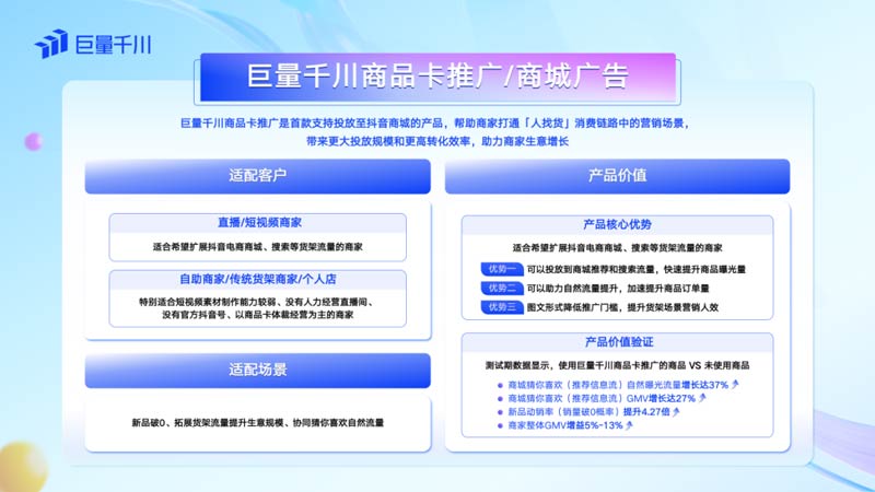 巨量千川商品卡推廣作為首款支持投放至抖音商城的產(chǎn)品,無需制作短視頻素材或經(jīng)營(yíng)直播間,只需要一鍵調(diào)用抖店商品主圖進(jìn)行推廣,就可以幫助商家打通「人找貨」消費(fèi)鏈路中的營(yíng)銷場(chǎng)景,為商家?guī)矶兑羯坛堑暮A苛髁繖C(jī)遇。