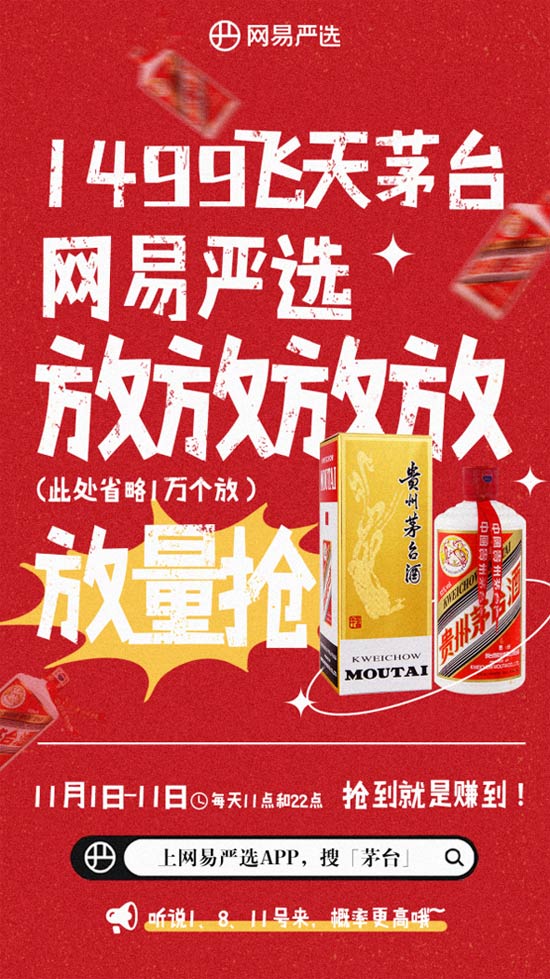 此外,11月1日至11日,網(wǎng)易嚴(yán)選APP將連續(xù)11天放量53度的飛天茅臺。而在網(wǎng)易嚴(yán)選天貓官方旗艦店,10月24日至11月3日期間,店鋪下單用戶即可參與大轉(zhuǎn)盤抽獎,抽整箱飛天茅臺。