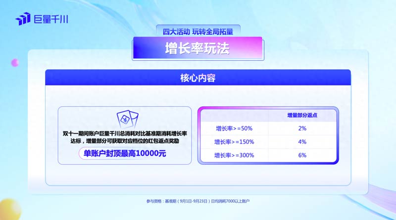 增長率玩法指的是在雙11期間,賬戶巨量千川總消耗對比基準期(9月1日-9月23日)消耗增長率達標的情況下,增量部分可以獲取對應檔位的紅包返點獎勵,單賬戶封頂最高10000元。