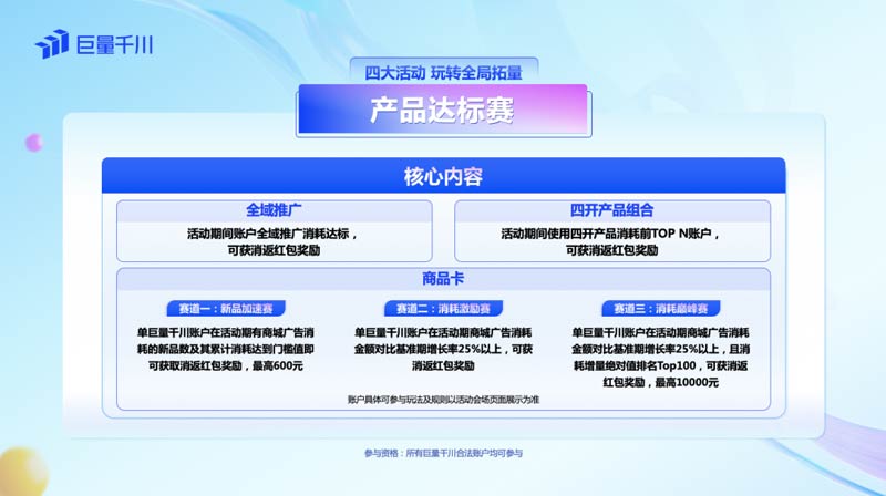 針對商品卡產(chǎn)品,產(chǎn)品達標賽的玩法又可以細分為三種,所有巨量千川合法賬戶均可參與。