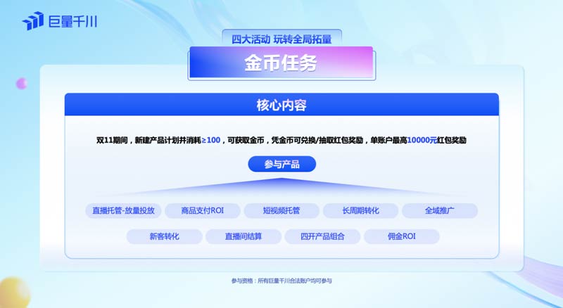 金幣任務同樣也是適配所有巨量千川合法賬戶,在雙11期間,新建產(chǎn)品計劃并消耗不低于100,賬戶就可以獲取金幣。商家可以憑借所獲取的金幣兌換或者抽取紅包獎勵,單賬戶紅包獎勵最高可達10000元。