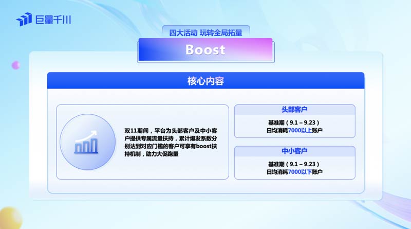 雙11期間,平臺將為頭部商家和中小型商家提供專屬流量扶持,累計爆發(fā)系數(shù)分別達到對應門檻的客戶,可以享有Boost扶持機制,幫助商家更好地在激烈的競爭中獲取流量。