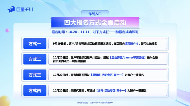 10月20日起,巨量千川雙11好物節(jié)四大報名方式全面啟動,在巨量千川后臺、星銷客和巨量引擎方舟的活動專區(qū)可一鍵式報名。