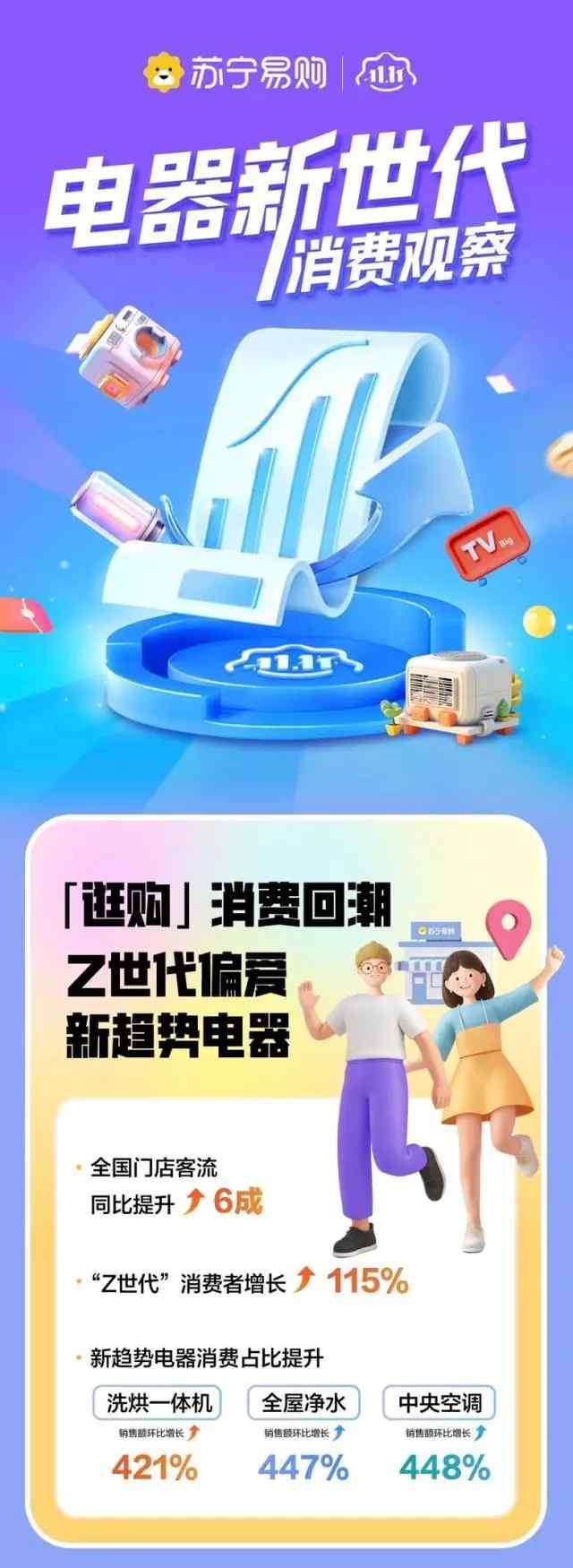 雙11線下逛購熱情高漲,家電趨勢新品受歡迎。11月1日,蘇寧易購發布“電器新世代消費觀察”。數據顯示,10月20日-11月1日,蘇寧易購全國門店客流同比提升6成,Z世代消費者增長115%。帶動新趨勢電器消費占比提升,其中洗烘一體機、全屋凈水、中央空調銷售額環比分別增長421%、447%和448%。消費者選購家電更關注好物好價、綠色智能、大容量大尺寸、多元功能等標簽。