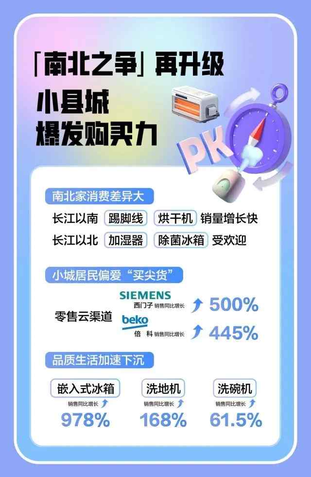值得一提的是,雙11期間,蘇寧易購發布“新家電下鄉”計劃,將讓更多新趨勢家電走向鄉村,讓消費者的“置家”體驗實現“從普及到換新”,“從更多到更好”,“從單品到解決方案”的全面升級。品質生活加速下沉,縣鎮居民更愛“尖貨好物”,蘇寧易購零售云數據顯示,嵌入式冰箱銷售額同比增978%,烘干機、洗碗機、洗地機銷售額同比增58%、62%和168%,西門子、倍科品牌產品銷售額同比增長500%和445%。