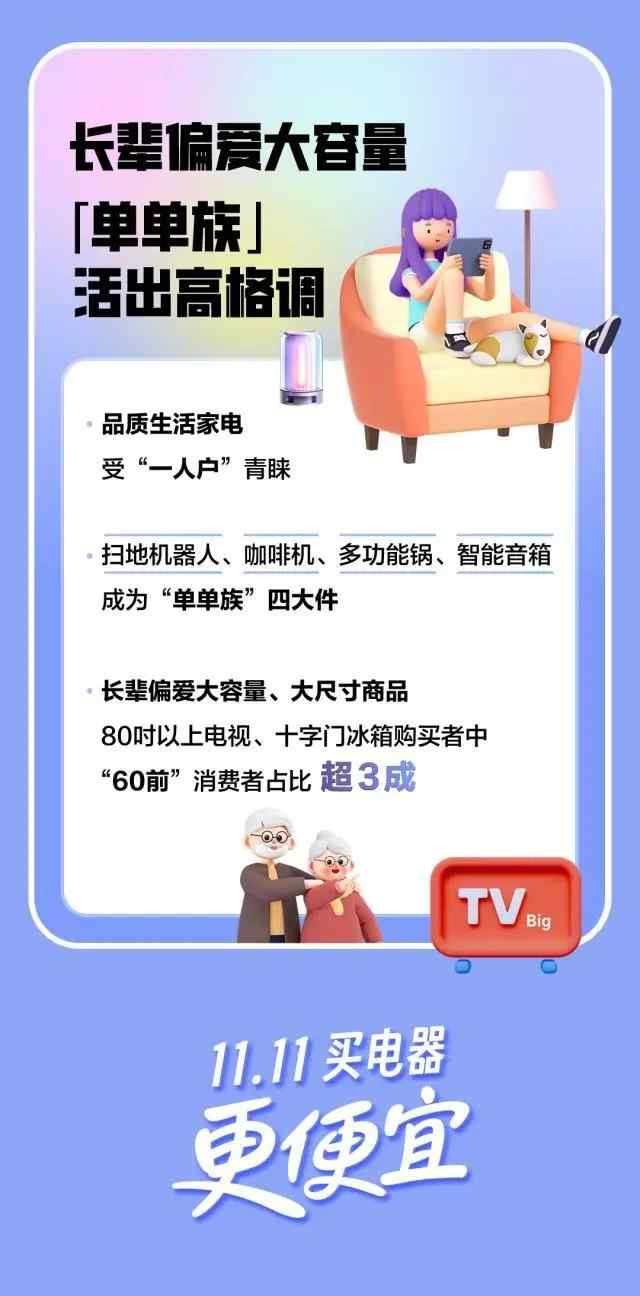 人群觀察來看,“銀發族”偏愛大容量、大尺寸家電產品,蘇寧易購數據顯示,80吋以上電視、十字門冰箱購買者中,“60前”消費者占比超3成。“一人戶”更傾向購買能夠提供“情緒價值”的家電產品,掃地機器人、咖啡機、多功能鍋、智能音箱成為雙11“單單族”四大件。雙11地區消費也呈現出明顯的南北差異,長江以南踢腳線、烘干機銷量增長快,以北加濕器、除菌冰箱更受歡迎。