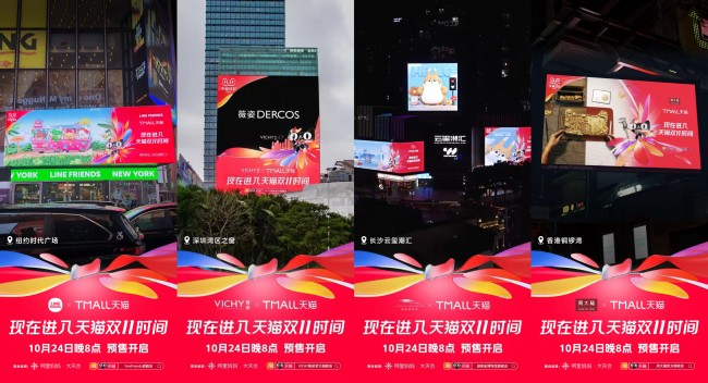 10月20日,第一個(gè)預(yù)售階段,從紐約時(shí)代廣場(chǎng)到深圳灣區(qū)之窗,天貓?jiān)谌蛩拇蠛诵纳倘ν斗拧绑@喜”大屏廣告,官宣進(jìn)入雙11時(shí)間。
