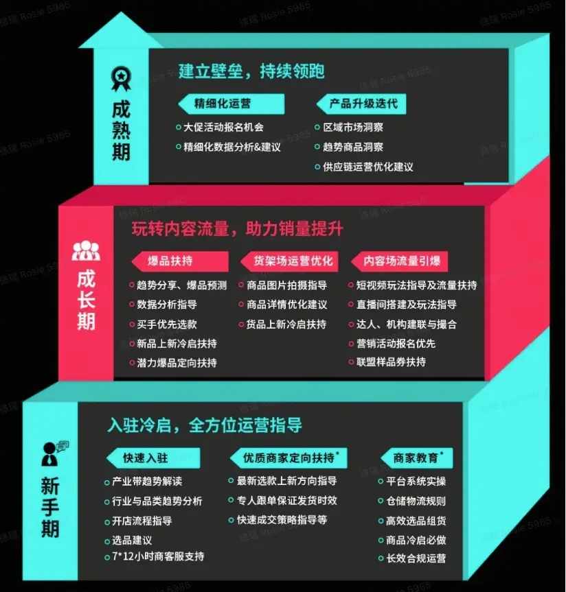 除了引人矚目的站內流量和全球銷售市場,TikTok Shop“產業帶100計劃”針對商家特點和需求,為不同商家量身定制了“新手、成長、成熟”三大成長階段對應的八大權益。