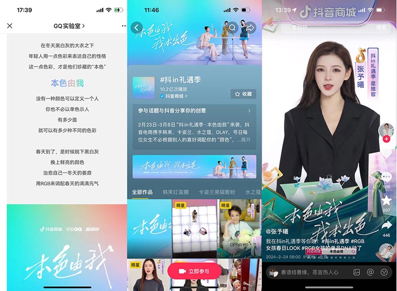 抖音電商發(fā)布的《2024抖音電商女性消費(fèi)趨勢數(shù)據(jù)報(bào)告》中指出,2023年3月-2024年2月,抖音電商女性購物訂單量對(duì)比同期增長了65%,其中又以精神文化、運(yùn)動(dòng)健身等“悅己”型消費(fèi)為主。“她經(jīng)濟(jì)”盛行的背景之下,抖音商城以色彩療愈和情緒營銷為抓手,自2月23日起啟動(dòng)【抖in禮遇季·本色由我】(下稱:抖in禮遇季)營銷IP,提出“本色由我,我本出色”IP主張,鼓勵(lì)女性大膽用色、隨心所欲用色彩表達(dá)態(tài)度與心情,閃耀本我之美。