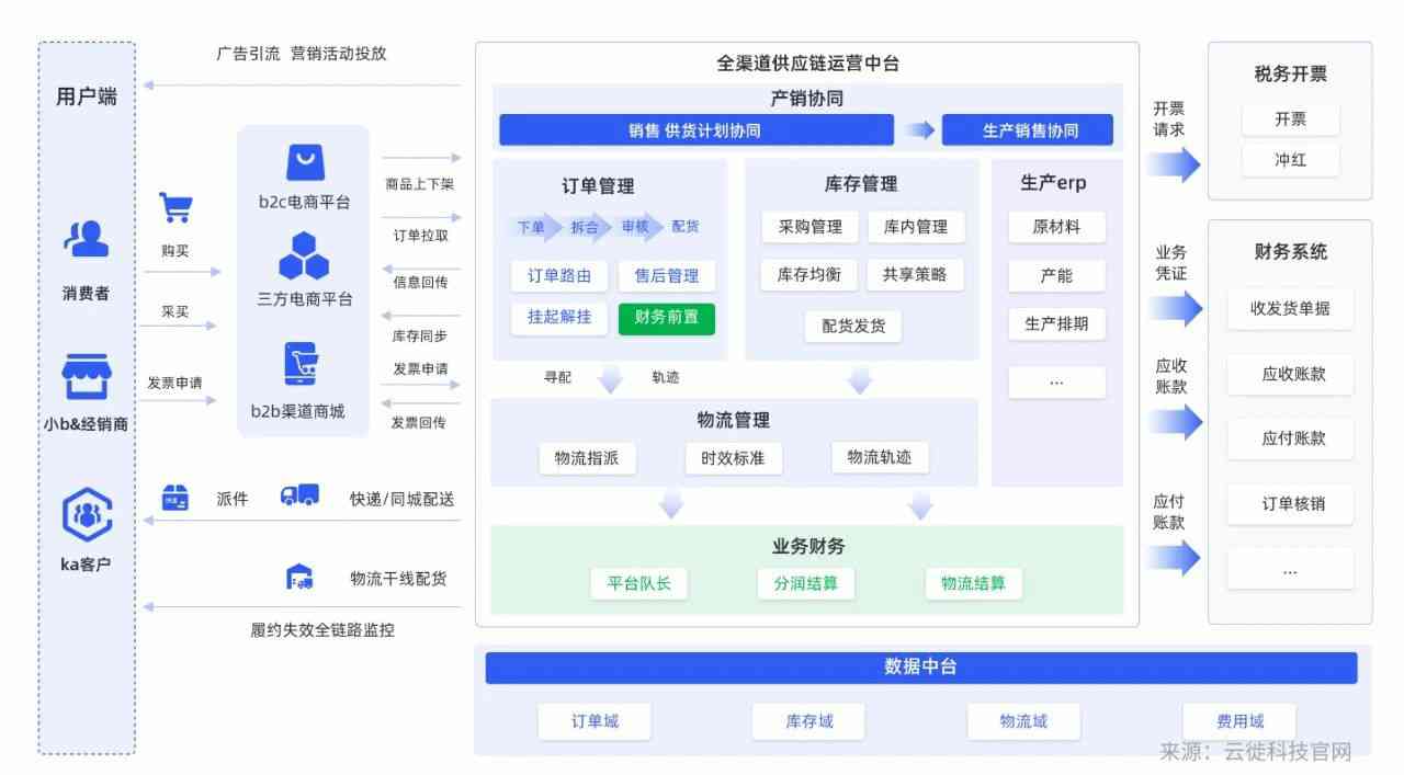 而云徙科技的供應鏈運營中臺是基于中臺架構設計的產品,領域模型抽象化,可支持業務策略橫向與縱向的擴展,可延伸信用管理、經銷商渠道管理、終端店鋪零售等交運營場景。