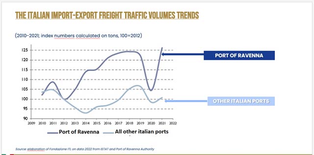 2023 年,港口總流量達 2550 萬噸貨物,奠定了其在意大利散貨和普通貨物領域的主導地位。若不包含石油運輸,拉文納港按流量計算為意大利第四大港口。