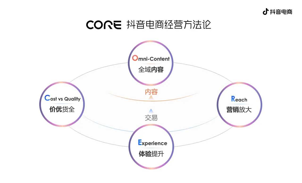 今年,抖音電商進一步升級流量算法機制,電商內容將在“內容”和“交易”兩個流量池同時分發,做好全域內容"O"將持續激發用戶需求,突破流量的天花板,同時做好“C”、“R”、“E”提升交易轉化,承接好用戶需求,CORE為生意帶來更廣闊的增長機會。