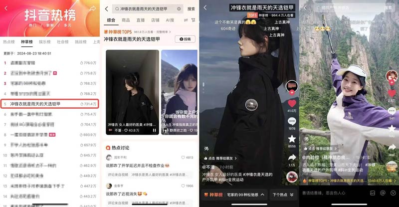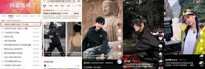 在抖音上,#沖鋒衣太好看所以愛上了戶外、#讓人期待秋天的山系穿搭、#分享我的AI人生沖鋒指南等關(guān)于沖鋒衣的話題持續(xù)發(fā)酵,多個(gè)熱點(diǎn)上榜。其中,#沖鋒衣太好看所以愛上了戶外 話題登上種草榜TOP 1,話題曝光超過2億,引發(fā)用戶主動(dòng)搜索超800萬次,讓沖鋒衣成為這個(gè)時(shí)節(jié)最具焦點(diǎn)的品類。