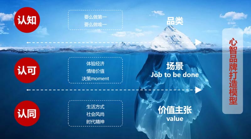 他提出,一個心智品牌的養成,分為三個核心階段:認知、認可、認同。如果將其比作一座冰山,認知浮于海面,認知的客體是品類;而認可和認同藏于海面之下,認可需要借助場景完成,認同需要借助價值主張在精神維度達成契合和共振。