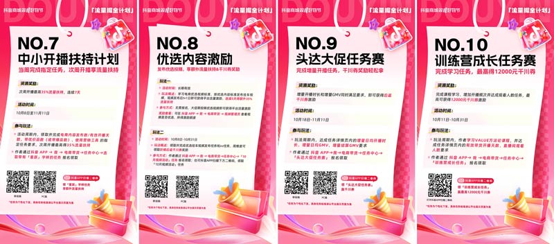 10月18日至11月11日期間,作者完成視頻投稿任務,即可瓜分5000萬流量。10月2日至10月31日期間,作者領取并完成指定掛車視頻發布任務,每周贏千川券獎勵。