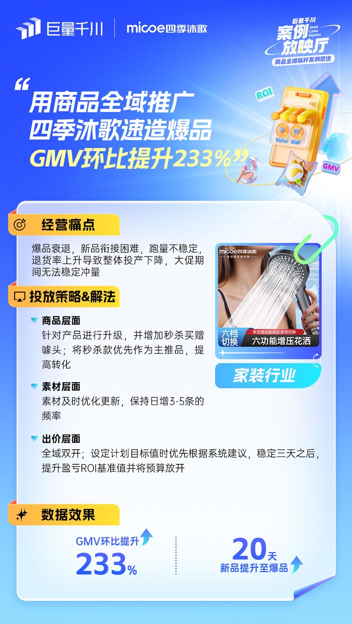 01 家裝商家四季沐歌用「商品全域推廣」,20天新品變爆品,GMV環比提升233%