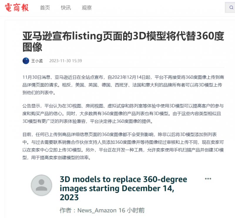 (亞馬遜宣布listing頁面3D模型功能將代替360°圖像)