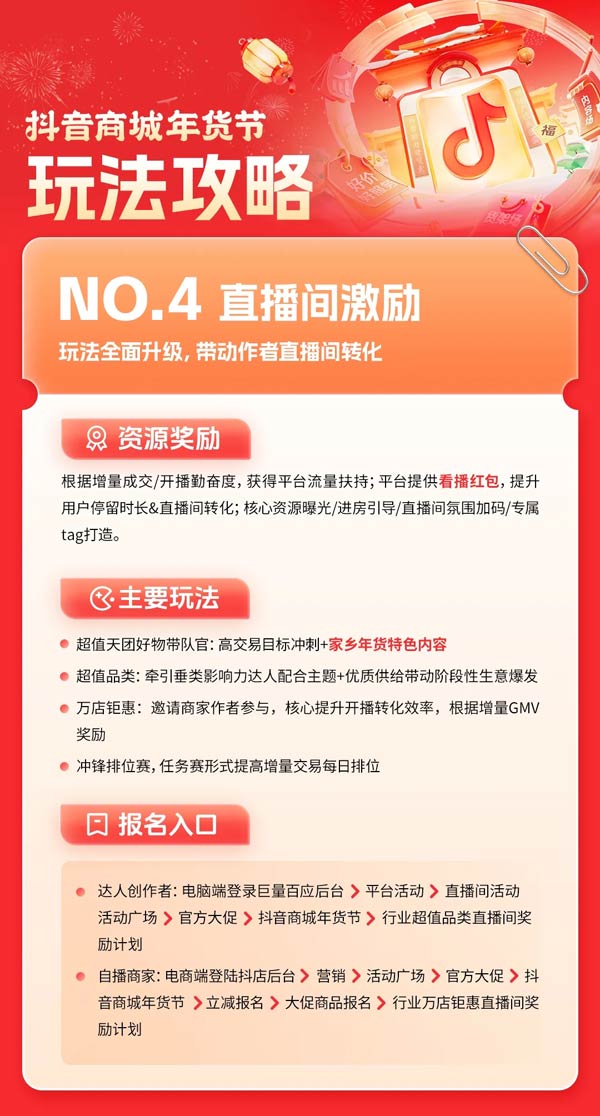 內容場,直播間玩法全面升級,超值天團好物帶隊官玩法,新增家鄉年貨特色內容,為消費者推薦一系列高品質、高性價比的年貨產品,引領年貨消費新潮流。平臺根據增量成交/開播勤奮度,提供流量扶持。同時對報名成功的直播間將提供看播紅包,幫助提升用戶停留時長和直播間轉化。在直播間引流上,抖音商城也將給到更多曝光扶持,如核心資源位,進房引導,直播間氛圍加碼,專屬tag打造等。