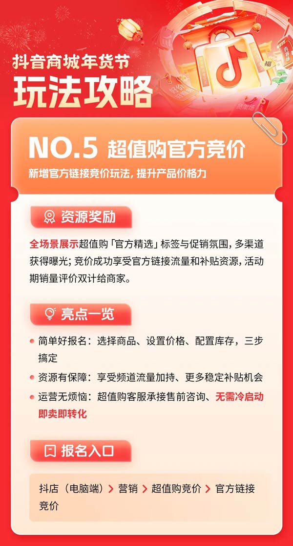 貨架場,商家可重點關注超值購玩法。作為抖音商城核心頻道,超值購是品牌爆款商品孵化與爆發的重要陣地。報名成功的商家在搜索、推薦、店鋪等全場景,享受億級曝光流量資源。更值得一提的是,超值購新增官方競價玩法,具有簡單好報名、資源有保障、運營無煩惱等優勢。參與報名的商品如果競價成功,可獲得全場景展示【超值購官方精選】標簽與促銷氛圍,多渠道獲得曝光,此外,官方鏈接商品將累積歷史成交的評價、銷量等資源,促進商品達成更多交易。