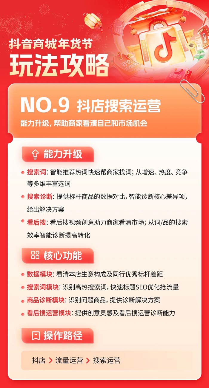04能力升級,搜索運營拓展大促增量在抖音做大促,更要做好搜索。搜索產品是商家重要的經營工具,能夠高效撬動生意增量。據抖音電商商家產品經理李南介紹,本次年貨節活動中,平臺將進一步對搜索產品進行升級。