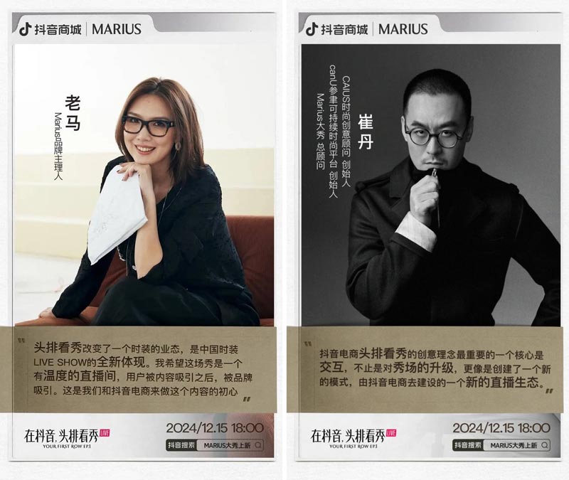 在即將啟動的首場大秀,抖音電商攜手CAIUS時尚創意顧問及canU參聿可持續時尚平臺創始人崔丹,作為項目總顧問共創大秀;Marius品牌主理人,在全網擁有百萬粉絲的紅人老馬,則作為首場合作品牌方的核心力量,深度融入參與大秀的每個環節;壹心娛樂董事長楊天真,將作為驚喜嘉賓出席,參與大秀互動。