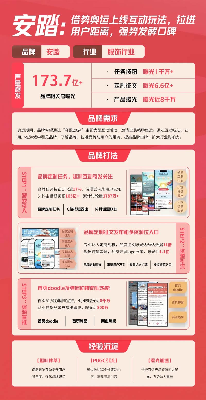 今年奧運(yùn)期間,安踏借勢(shì)熱點(diǎn)合作今日頭條發(fā)起“奪冠 2024”主題大型互動(dòng)活動(dòng)。品牌通過(guò)在平臺(tái)定制互動(dòng)游戲,將頻道內(nèi)容和安踏主推品相結(jié)合。