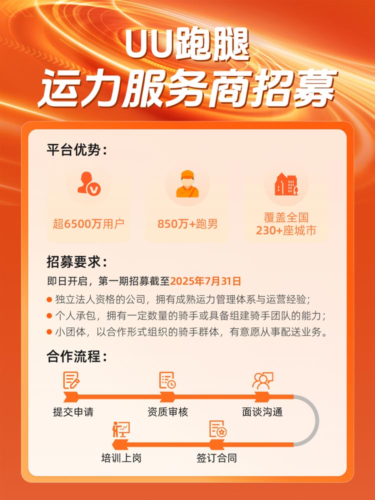 作為中國領先的即時服務平臺,UU跑腿累計服務用戶超6500萬,日均處理訂單量突破百萬級,業(yè)務覆蓋同城配送、幫買幫送、代排隊等服務場景。本次招募覆蓋北京市、天津市、廊坊市、哈爾濱市、延安市、成都市、重慶市、深圳市、上海市等重點城市,首期合作申請截止至2025年7月31日。意向合作方可通過官方渠道獲取《運力合作白皮書》關注UU跑腿官方了解區(qū)域政策細則。