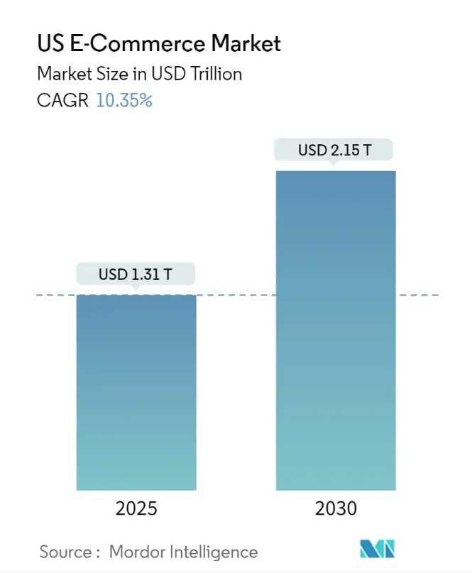 得益于龐大的消費群體基礎(chǔ)和成熟的多元化供應(yīng)商生態(tài),美國電商市場高度繁榮。據(jù)Mordor Intelligence數(shù)據(jù)顯示,至2025年,美國電商市場規(guī)模估計為 1.31 萬億美元,預(yù)計2025年至2030年的復(fù)合年增長率為10.35%。